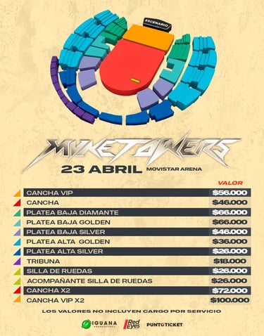 En la siguiente imagen te dejamos el detalle con las ubicaciones y precios para el evento (Precios no incluyen cargo por servicio). Las entradas las puedes adquirir a través de Punto Ticket: